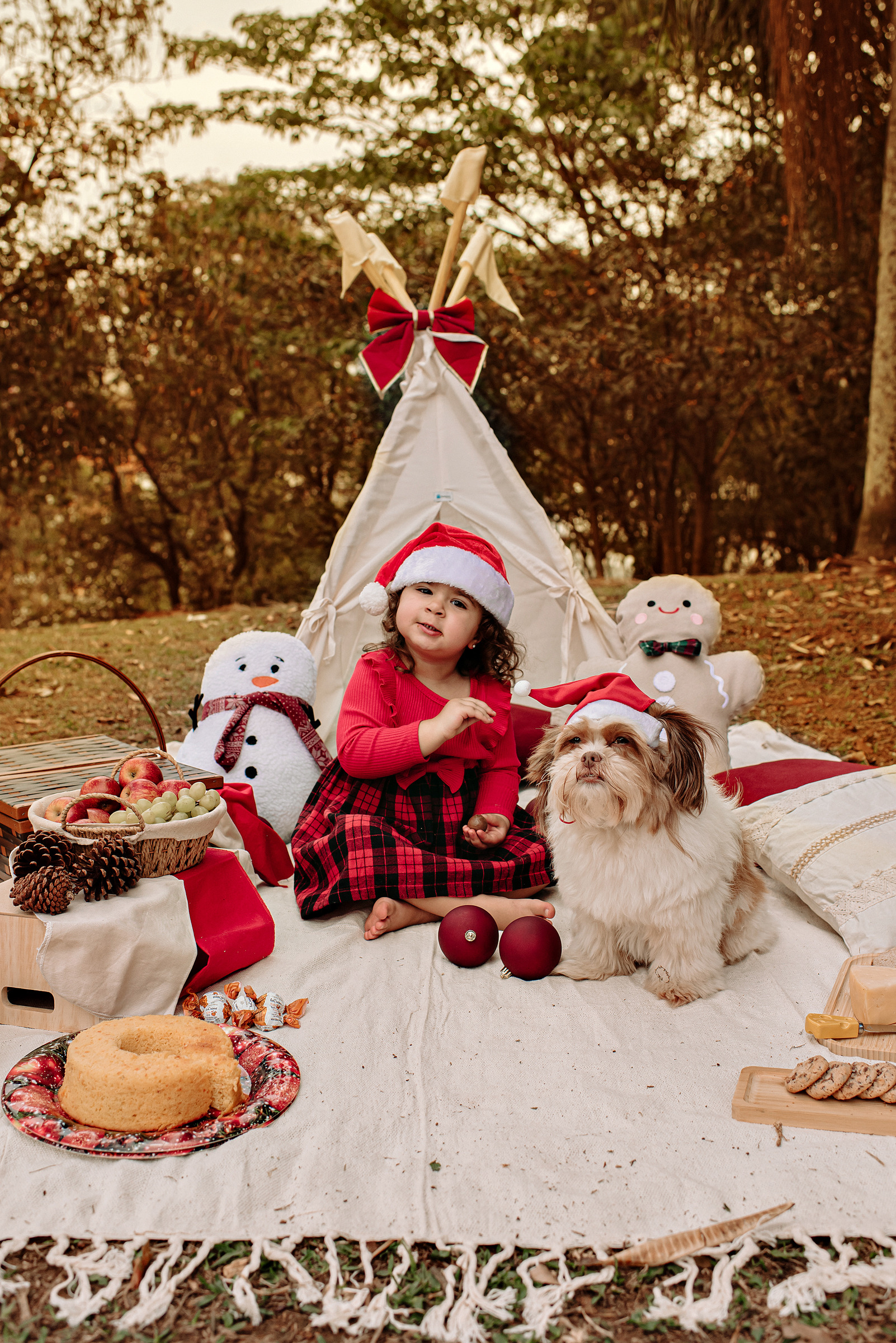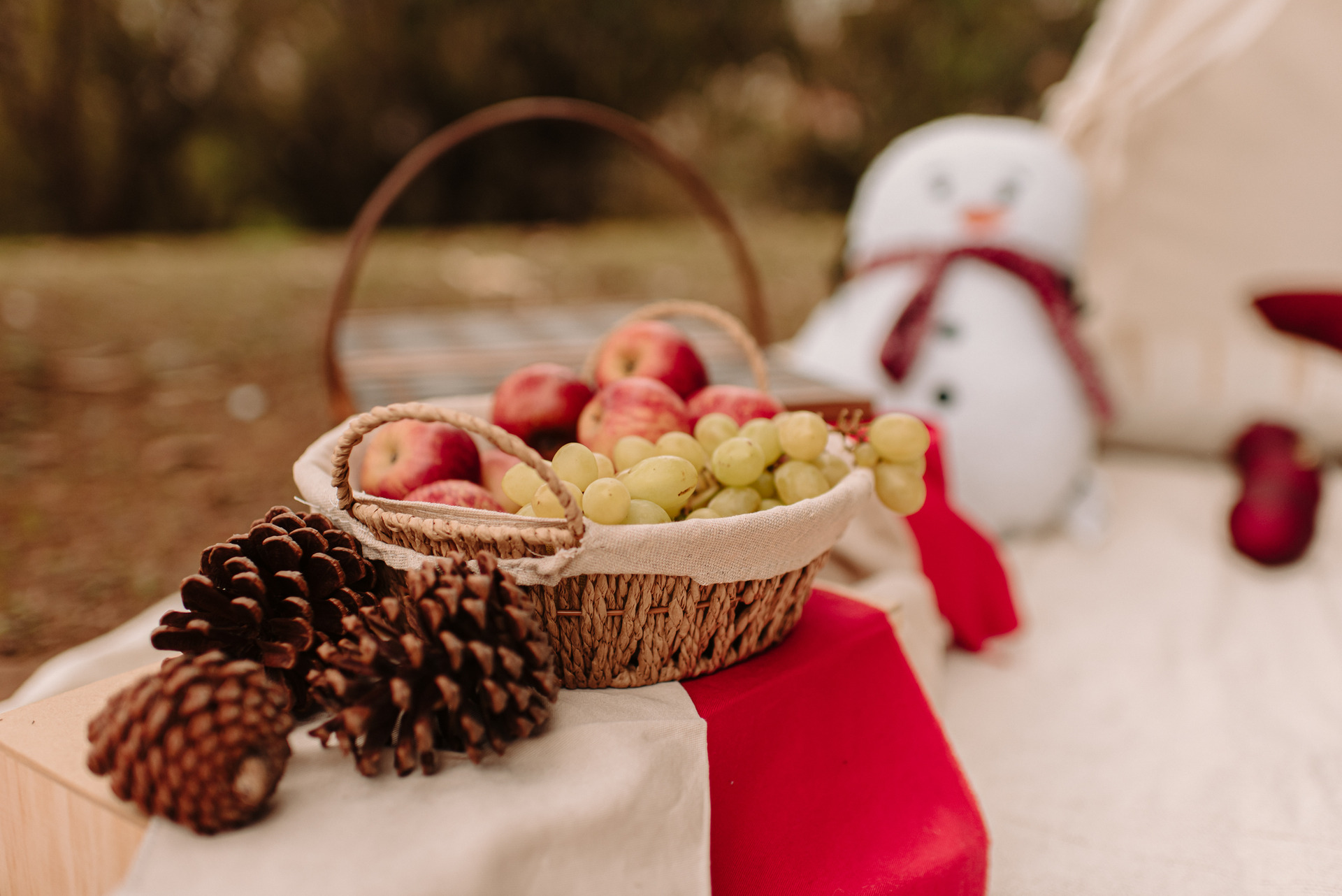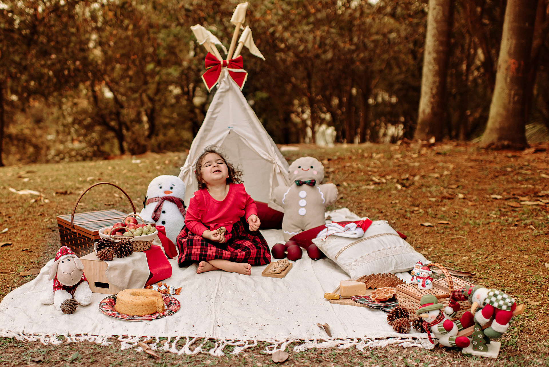 Um piquenique natalino com biscoitos, frutas e detalhes que trazem a magia dessa época.